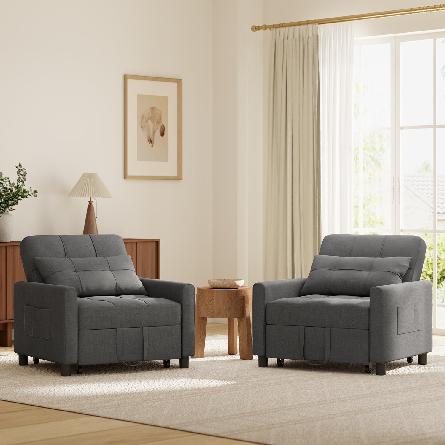 Sekundenschnelle Verwandlung: Dank der integrierten 4 Rollen und der praktischen Trageschlaufen lässt sich das Sofa mühelos vom Sessel in ein bequemes Bett verwandeln.
