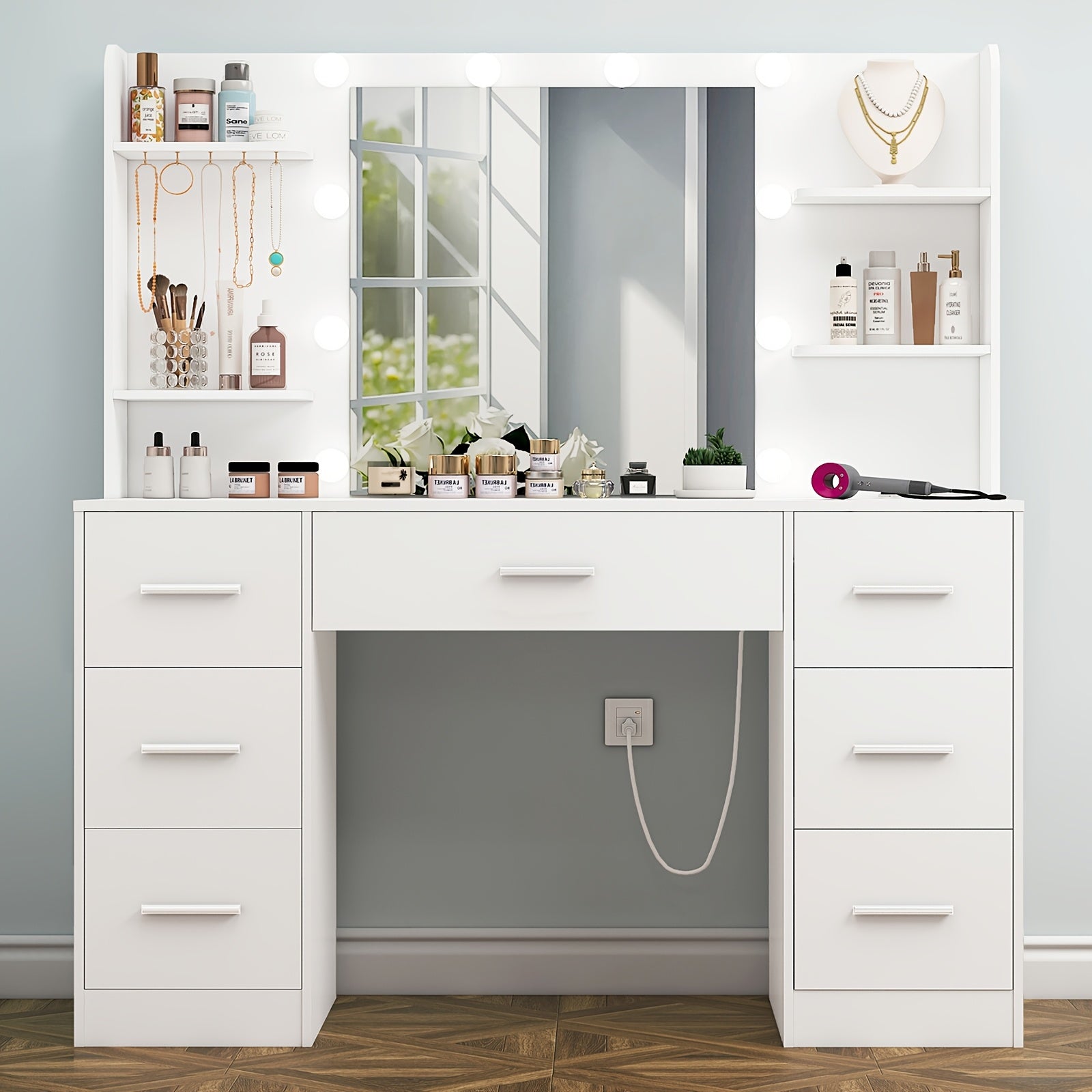 Luxus XXL-Schminktisch | LED-Beleuchtung & Integrierte Steckdose | 7 Schubladen, 4 Regale & 5 Haken | Maximale Organisation für Schlafzimmer & Bad