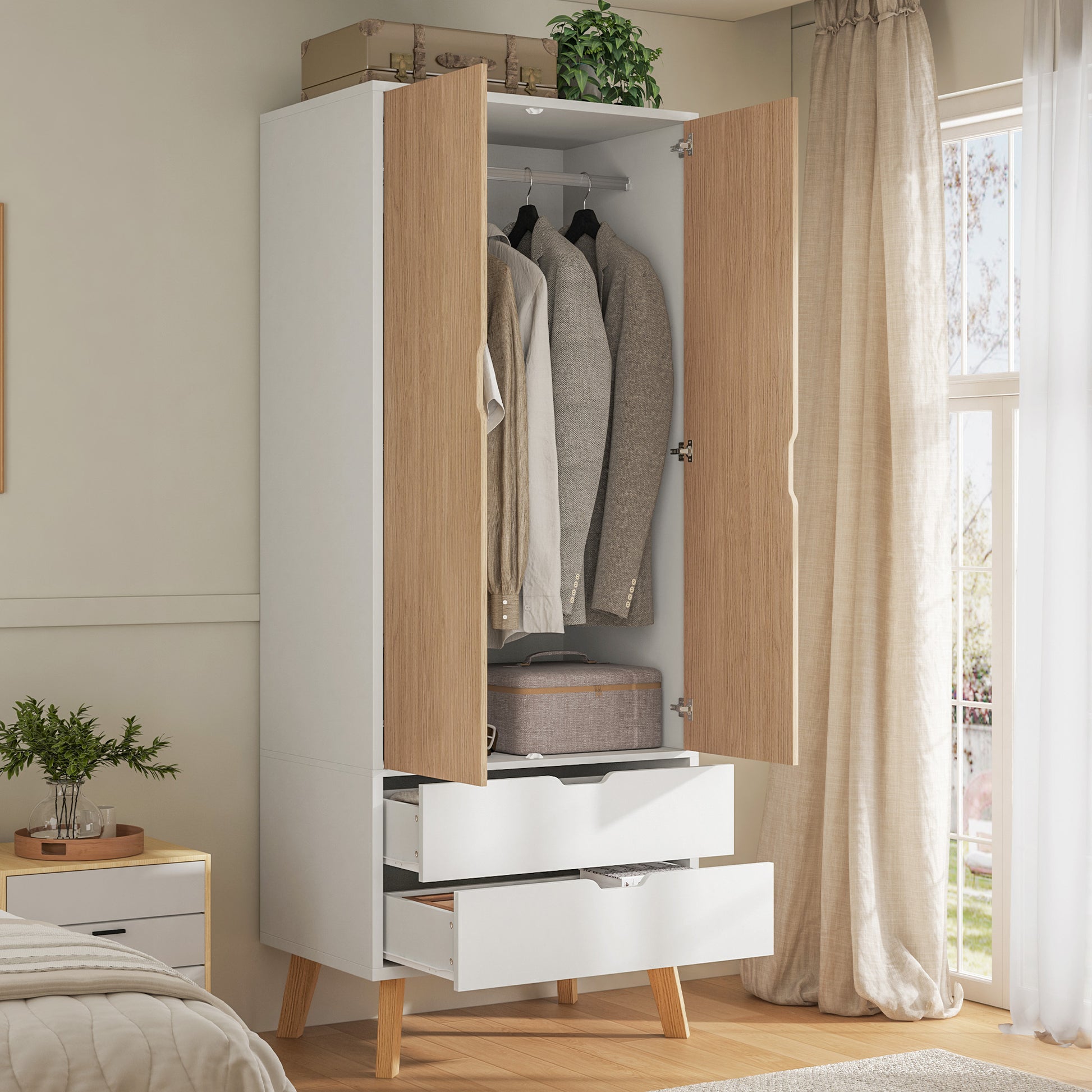 Moderner Design-Kleiderschrank | Weiß & Eiche-Optik | 198 cm Hoch | Inkl. Kleiderstange & 2 Schubladen | Schlankes Raumwunder